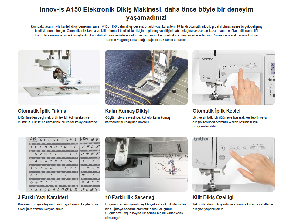 • Geçmişten günümüze kadar uzanan üstün Brother Japon teknolojisinin hobiyi sanata dönüştürmek için ürettiği aynı zamanda sürekli geliştirdiği elektronik dikiş makinelerinden A150 kompakt ve kullanımı oldukça kolay hale getiren A serisi sizlere kusursuz dikiş ve onarım imkanları sunmaktadır.