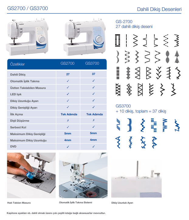 • 27 farklı dahili dikiş deseni (kullanım, dekoratif ve temel dikişler)